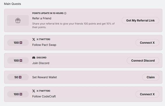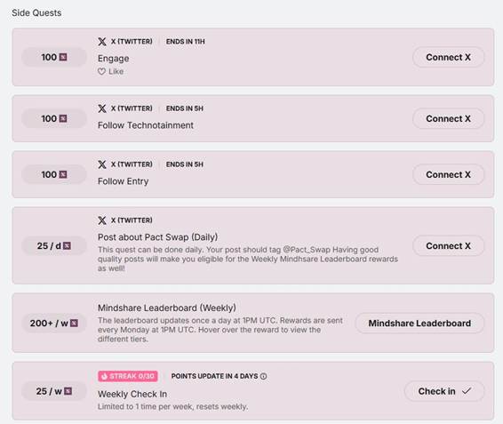 PACTトークンの配布量は「ポイントの割合」で決まるため、日々のポイント獲得がもっとも重要になります。PactSwapでは、次のような複数のタスクを通じてポイントを貯めることができます。