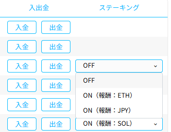 ETH、SOL、ADA、ATOMなど計8銘柄に対応しています。国内ではトップクラスの対応数です。